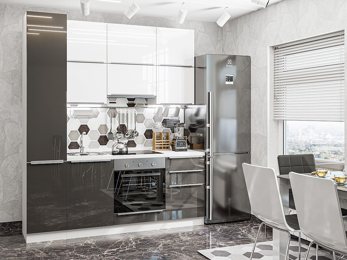 Фьюжн-06 Angel/Anthracite 61270.Расположение Прямая. Размер (В*Ш*Г) мм 2340*2000*600. Цвет каркасов Белый. Материал каркасов ЛДСП. Цвет фасадов Angel/Anthracite. Материал фасадов МДФ. Отделка фасадов Акрилит. Толщина кромки мм 1.Внимание Ручка в комплект не входит.. Стекло . Столешница Антарес. Толщина столешницы мм 38