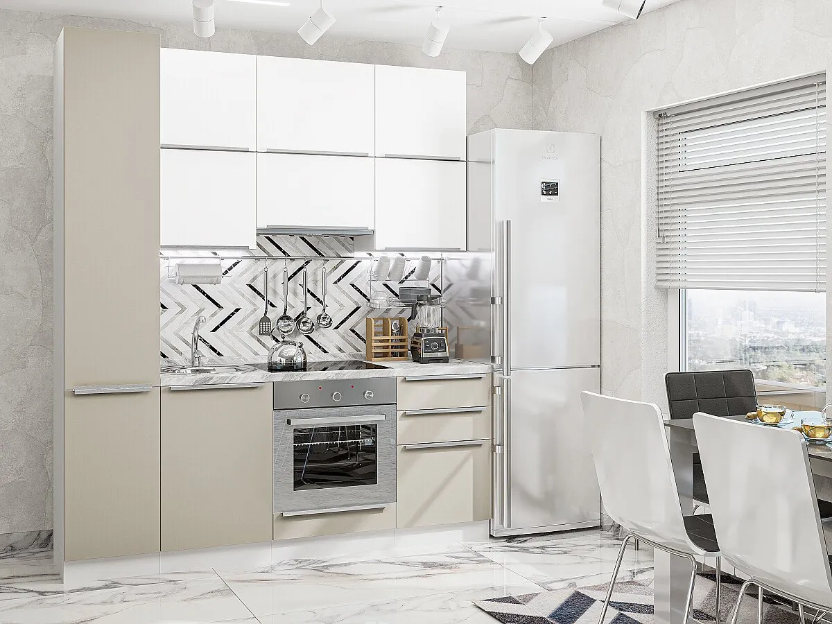 Фьюжн-06 Silky White/Silky Grey 61269.Расположение Прямая. Размер (В*Ш*Г) мм 2340*2000*600. Цвет каркасов Белый. Материал каркасов ЛДСП. Цвет фасадов Silky White/Silky Grey. Материал фасадов МДФ. Отделка фасадов ПЭТ. Толщина кромки мм 1.Внимание Ручка в комплект не входит.. Стекло . Столешница Снежный мрамор. Толщина столешницы мм 38