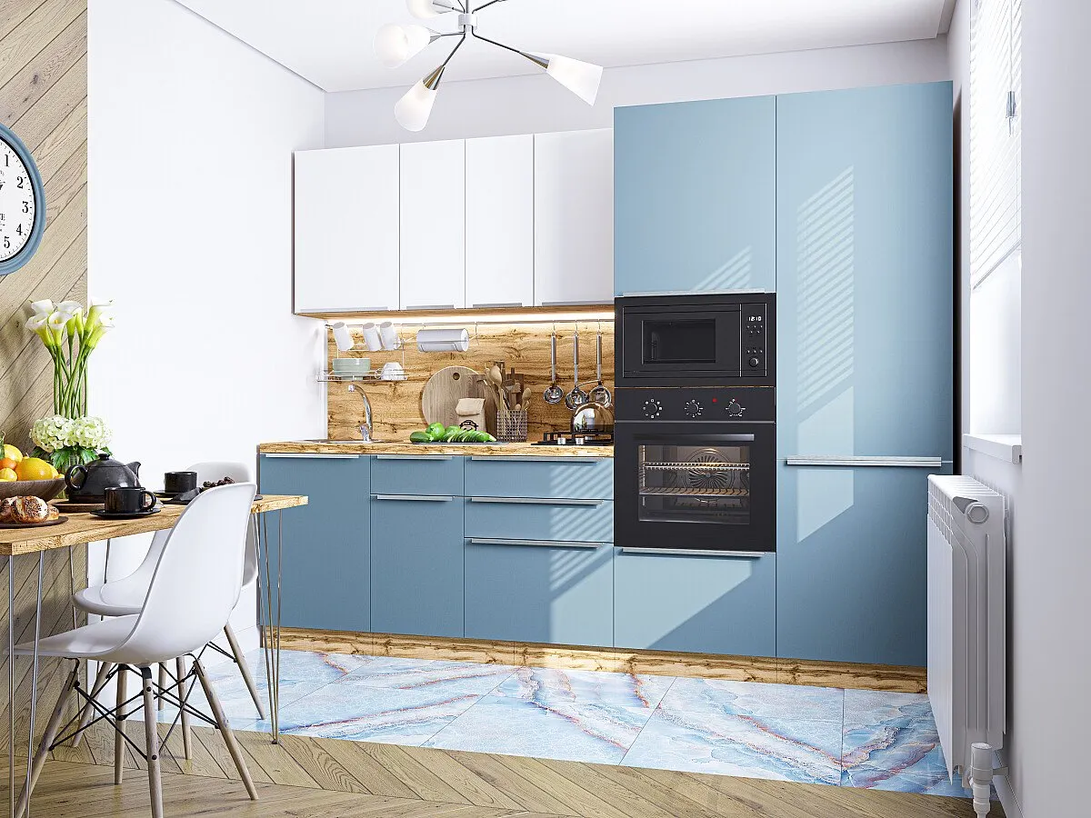 Фьюжн-07 Silky White/Silky Blue 67017.Расположение Прямая. Размер (В*Ш*Г) мм 2140*2700*600. Цвет каркасов Дуб Вотан. Материал каркасов ЛДСП. Цвет фасадов Silky White/Silky Blue. Материал фасадов МДФ. Отделка фасадов ПЭТ. Толщина кромки мм 1.Внимание Ручка в комплект не входит.. Стекло . Столешница Дуб натуральный. Толщина столешницы мм 38