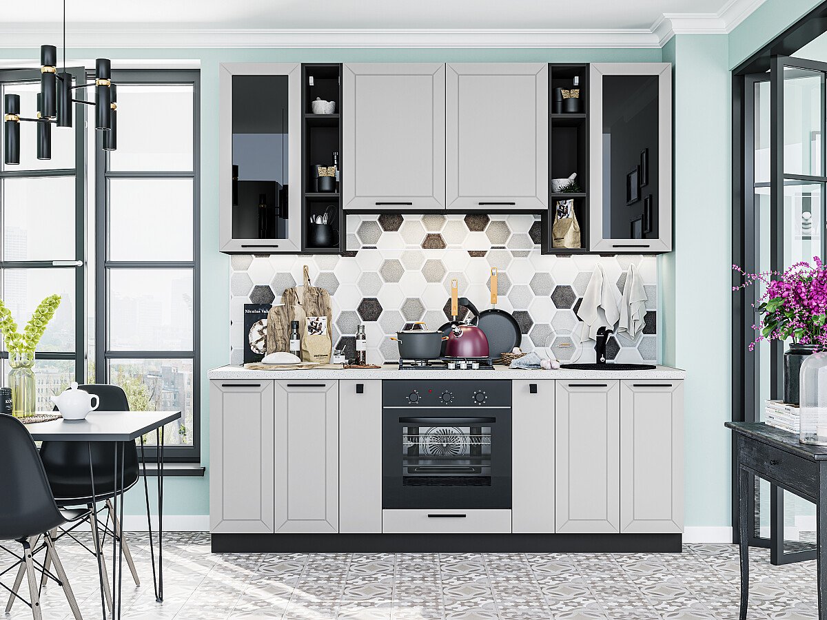 Глетчер-01 Гейнсборо Силк 77640.Расположение Прямая. Размер (В*Ш*Г) мм 2340*2200*600. Цвет каркасов Graphite. Материал каркасов ЛДСП. Цвет фасадов Гейнсборо Силк. Материал фасадов МДФ/Стекло. Отделка фасадов Пленка ПВХ «Soft Touch».. Толщина кромки мм .В комплект входит ручка профильная № 104 в цвете Антрацит с межцентровым расстоянием 160 мм и ручка кнопка № 85 в цвете Антрацит. Стекло Lacobel Black. Столешница Антарес. Толщина столешницы мм 38