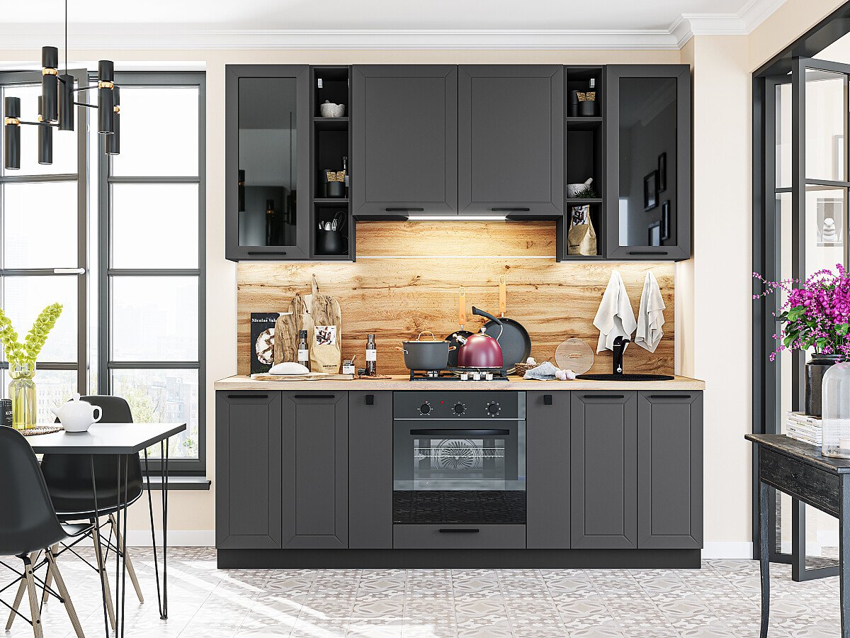 Глетчер-01 Маренго Силк 77641.Расположение Прямая. Размер (В*Ш*Г) мм 2340*2200*600. Цвет каркасов Graphite. Материал каркасов ЛДСП. Цвет фасадов Маренго Силк. Материал фасадов МДФ/Стекло. Отделка фасадов Пленка ПВХ «Soft Touch».. Толщина кромки мм .В комплект входит ручка профильная № 104 в цвете Антрацит с межцентровым расстоянием 160 мм и ручка кнопка № 85 в цвете Антрацит. Стекло Lacobel Black. Столешница Дуб натуральный. Толщина столешницы мм 38
