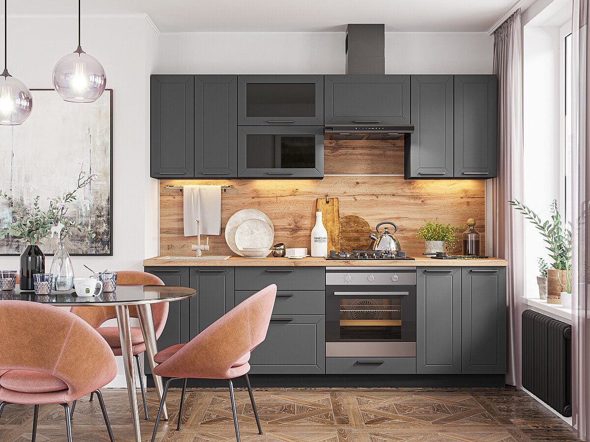Глетчер-02 Маренго Силк 77644.Расположение Прямая. Размер (В*Ш*Г) мм 2140*2400*600. Цвет каркасов Graphite. Материал каркасов ЛДСП. Цвет фасадов Маренго Силк. Материал фасадов МДФ/Стекло. Отделка фасадов Пленка ПВХ «Soft Touch».. Толщина кромки мм .В комплект входит ручка профильная № 104 в цвете Антрацит с межцентровым расстоянием 160 мм. Стекло Lacobel Black. Столешница Дуб натуральный. Толщина столешницы мм 38