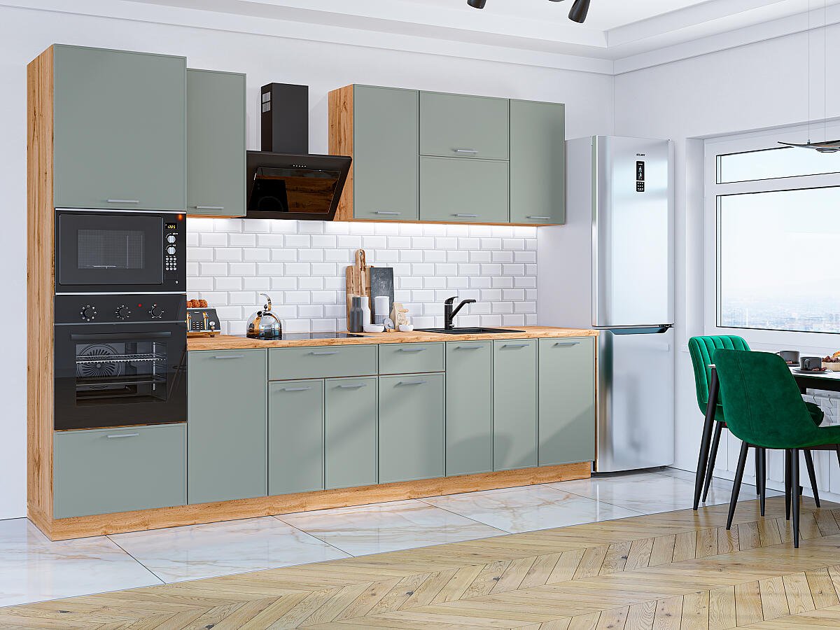 Квадро-01 Аквамарин 74585.Расположение Прямая. Размер (В*Ш*Г) мм 2140*3000*600. Цвет каркасов Дуб Вотан. Материал каркасов ЛДСП. Цвет фасадов Аквамарин. Материал фасадов МДФ. Отделка фасадов Пленка ПВХ.. Толщина кромки мм .Внимание Ручка в комплект не входит.. Стекло . Столешница Дуб натуральный. Толщина столешницы мм 38