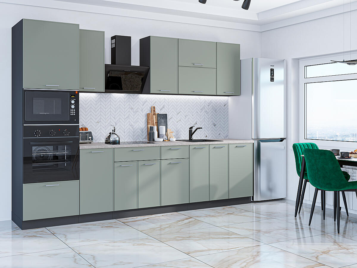 Квадро-01 Аквамарин 74589.Расположение Прямая. Размер (В*Ш*Г) мм 2140*3000*600. Цвет каркасов Graphite. Материал каркасов ЛДСП. Цвет фасадов Аквамарин. Материал фасадов МДФ. Отделка фасадов Пленка ПВХ.. Толщина кромки мм .Внимание Ручка в комплект не входит.. Стекло . Столешница Черный детройт. Толщина столешницы мм 38