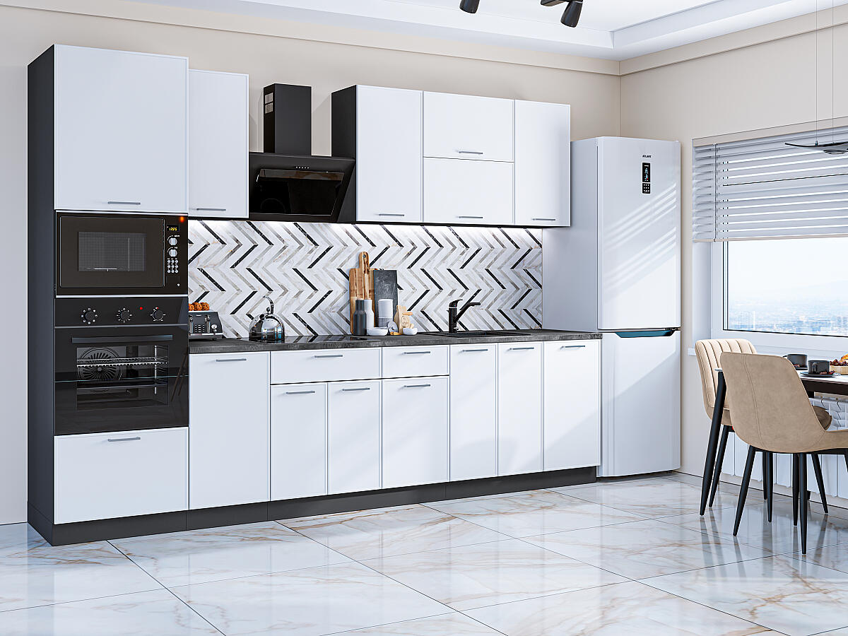 Квадро-01 Белый 74587.Расположение Прямая. Размер (В*Ш*Г) мм 2140*3000*600. Цвет каркасов Graphite. Материал каркасов ЛДСП. Цвет фасадов Белый. Материал фасадов МДФ. Отделка фасадов Пленка ПВХ.. Толщина кромки мм .Внимание Ручка в комплект не входит.. Стекло . Столешница Черный детройт. Толщина столешницы мм 38