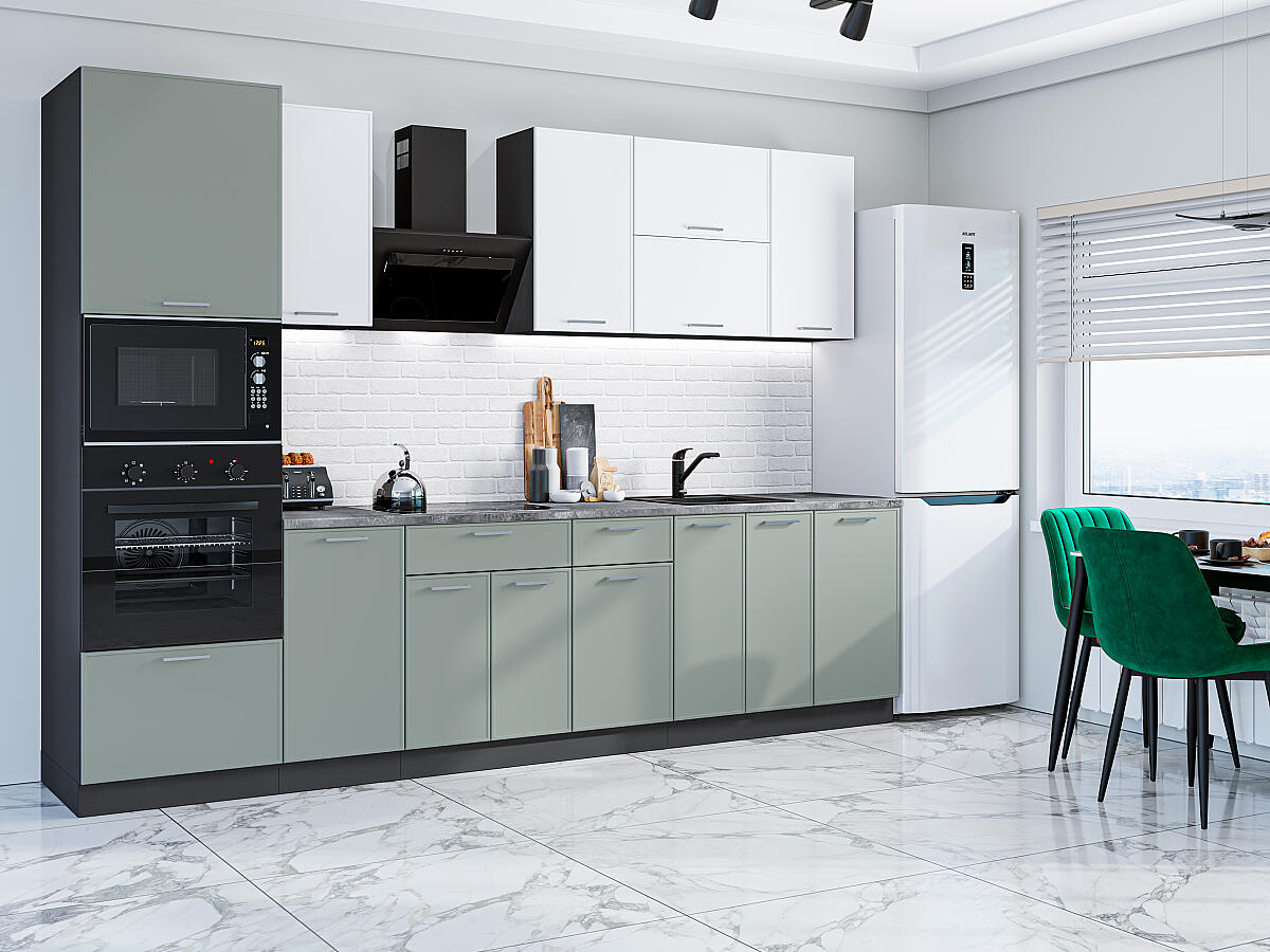 Квадро-01 Белый/Аквамарин 74588.Расположение Прямая. Размер (В*Ш*Г) мм 2140*3000*600. Цвет каркасов Graphite. Материал каркасов ЛДСП. Цвет фасадов Белый/Аквамарин. Материал фасадов МДФ. Отделка фасадов Пленка ПВХ.. Толщина кромки мм .Внимание Ручка в комплект не входит.. Стекло . Столешница Черный детройт. Толщина столешницы мм 38