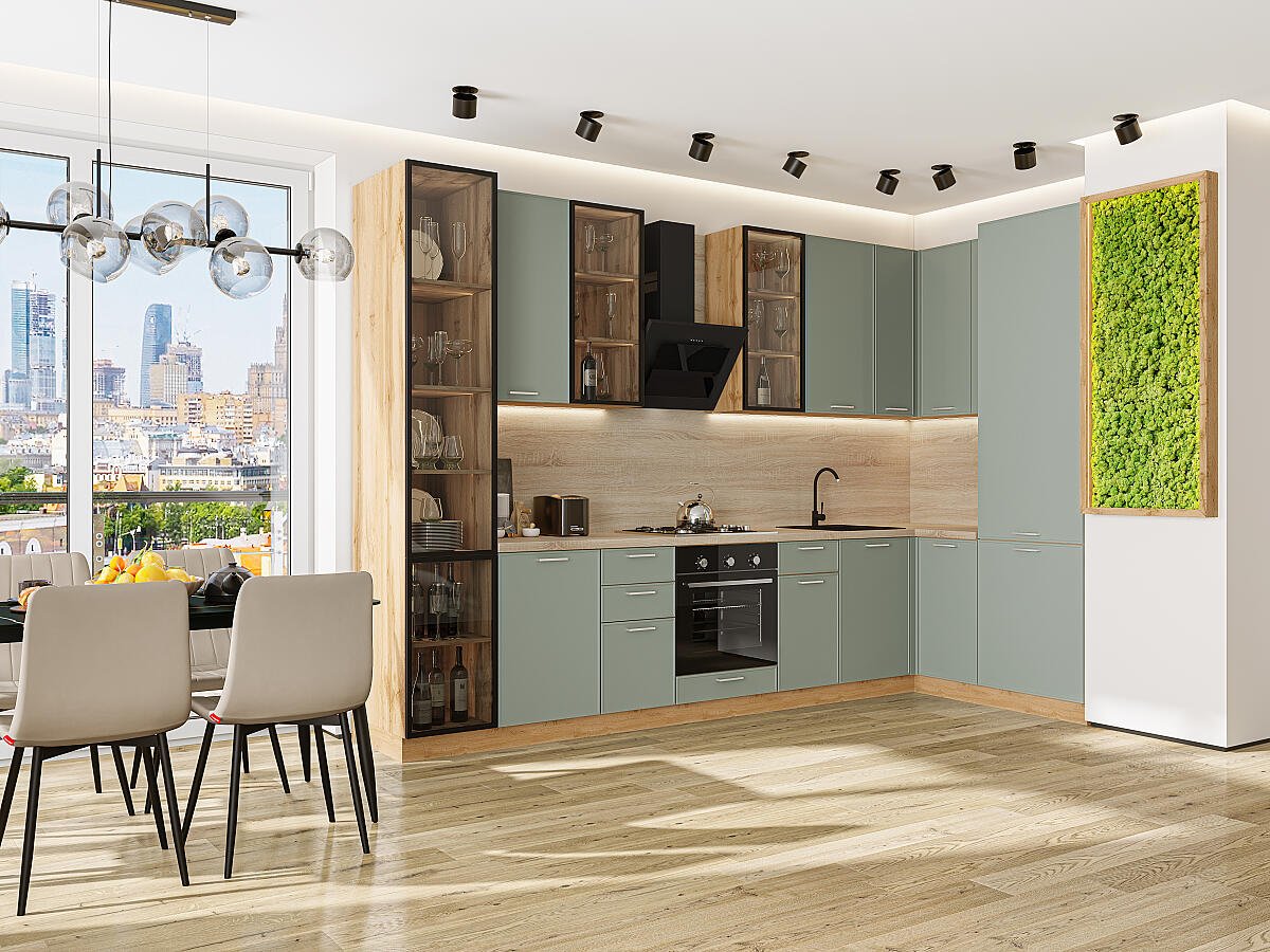 Квадро-04 Аквамарин 79620.Расположение Угловая. Размер (В*Ш*Г) мм 2340*3400/1600*600. Цвет каркасов Дуб Вотан. Материал каркасов ЛДСП. Цвет фасадов Аквамарин. Материал фасадов МДФ. Отделка фасадов Пленка ПВХ.. Толщина кромки мм .Внимание Ручка в комплект не входит.. Стекло . Столешница Дуб сонома. Толщина столешницы мм 38