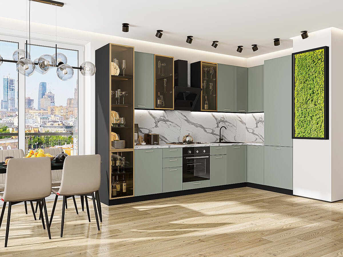 Квадро-04 Аквамарин 79702.Расположение Угловая. Размер (В*Ш*Г) мм 2340*3400/1600*600. Цвет каркасов Graphite. Материал каркасов ЛДСП. Цвет фасадов Аквамарин. Материал фасадов МДФ. Отделка фасадов Пленка ПВХ.. Толщина кромки мм .Внимание Ручка в комплект не входит.. Стекло . Столешница Гранит белый. Толщина столешницы мм 38