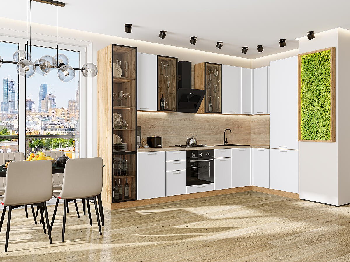 Квадро-04 Белый 79695.Расположение Угловая. Размер (В*Ш*Г) мм 2340*3400/1600*600. Цвет каркасов Дуб Вотан. Материал каркасов ЛДСП. Цвет фасадов Белый. Материал фасадов МДФ. Отделка фасадов Пленка ПВХ.. Толщина кромки мм .Внимание Ручка в комплект не входит.. Стекло . Столешница Дуб сонома. Толщина столешницы мм 38