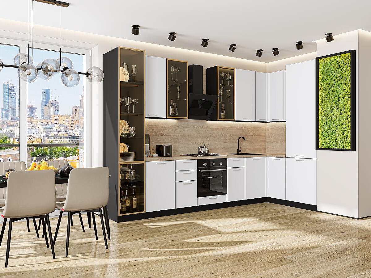 Квадро-04 Белый 79696.Расположение Угловая. Размер (В*Ш*Г) мм 2340*3400/1600*600. Цвет каркасов Graphite. Материал каркасов ЛДСП. Цвет фасадов Белый. Материал фасадов МДФ. Отделка фасадов Пленка ПВХ.. Толщина кромки мм .Внимание Ручка в комплект не входит.. Стекло . Столешница Дуб сонома. Толщина столешницы мм 38