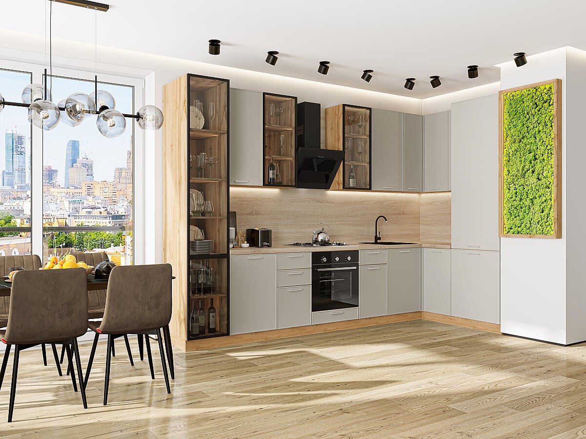 Квадро-04 Кашемир 79617.Расположение Угловая. Размер (В*Ш*Г) мм 2340*3400/1600*600. Цвет каркасов Дуб Вотан. Материал каркасов ЛДСП. Цвет фасадов Кашемир. Материал фасадов МДФ. Отделка фасадов Пленка ПВХ.. Толщина кромки мм .Внимание Ручка в комплект не входит.. Стекло . Столешница Дуб сонома. Толщина столешницы мм 38