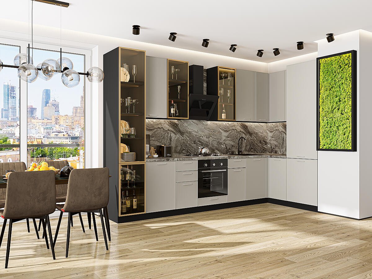 Квадро-04 Кашемир 79618.Расположение Угловая. Размер (В*Ш*Г) мм 2340*3400/1600*600. Цвет каркасов Graphite. Материал каркасов ЛДСП. Цвет фасадов Кашемир. Материал фасадов МДФ. Отделка фасадов Пленка ПВХ.. Толщина кромки мм .Внимание Ручка в комплект не входит.. Стекло . Столешница Мрамор горный. Толщина столешницы мм 38