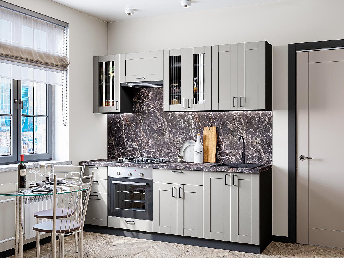 Лофт-01 Grey Silk 71785.Расположение Прямая. Размер (В*Ш*Г) мм 2140*2200*600. Цвет каркасов Graphite. Материал каркасов ЛДСП. Цвет фасадов Grey Silk. Материал фасадов МДФ/Стекло. Отделка фасадов ПЭТ. Толщина кромки мм .. Стекло Рифлёное Magic Moru V.. Столешница Мрамор черный. Толщина столешницы мм 38
