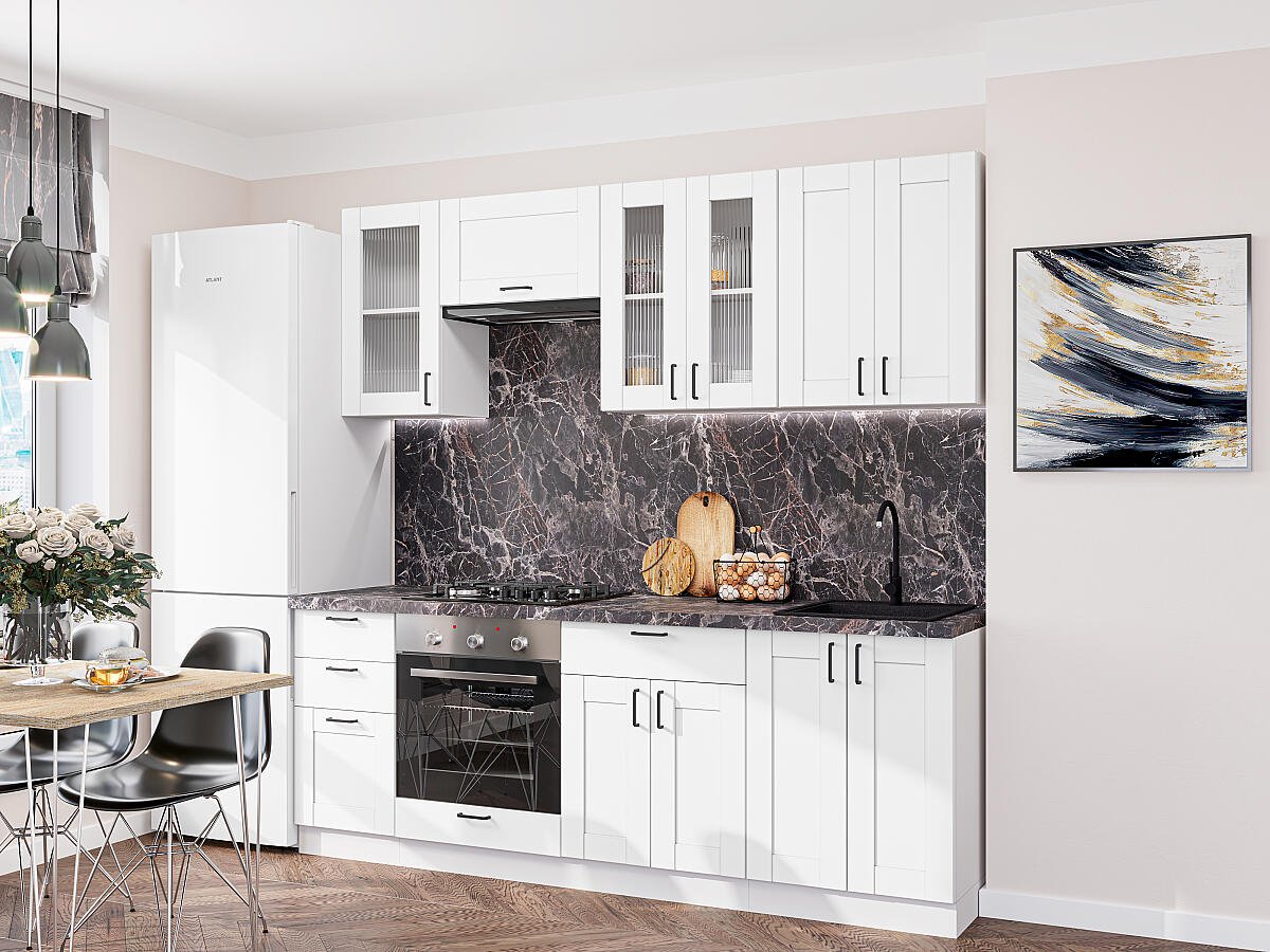 Лофт-01 White Silk 71782.Расположение Прямая. Размер (В*Ш*Г) мм 2140*2200*600. Цвет каркасов Белый. Материал каркасов ЛДСП. Цвет фасадов White Silk. Материал фасадов МДФ/Стекло. Отделка фасадов ПЭТ. Толщина кромки мм .. Стекло Рифлёное Magic Moru V.. Столешница Мрамор черный. Толщина столешницы мм 38