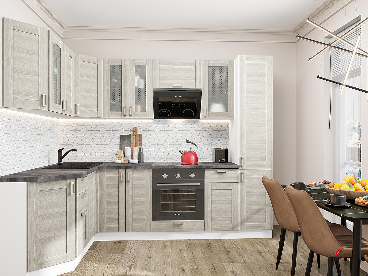 Лофт-04 Cappuccino Veralinga 22693.Расположение Угловая. Размер (В*Ш*Г) мм 2140*1700/2600*600. Цвет каркасов Белый. Материал каркасов ЛДСП. Цвет фасадов Cappuccino Veralinga. Материал фасадов МДФ/Стекло. Отделка фасадов Эко Шпон. Толщина кромки мм .. Стекло Сатинато белое художественное White Matrix.. Столешница Черный детройт. Толщина столешницы мм 38