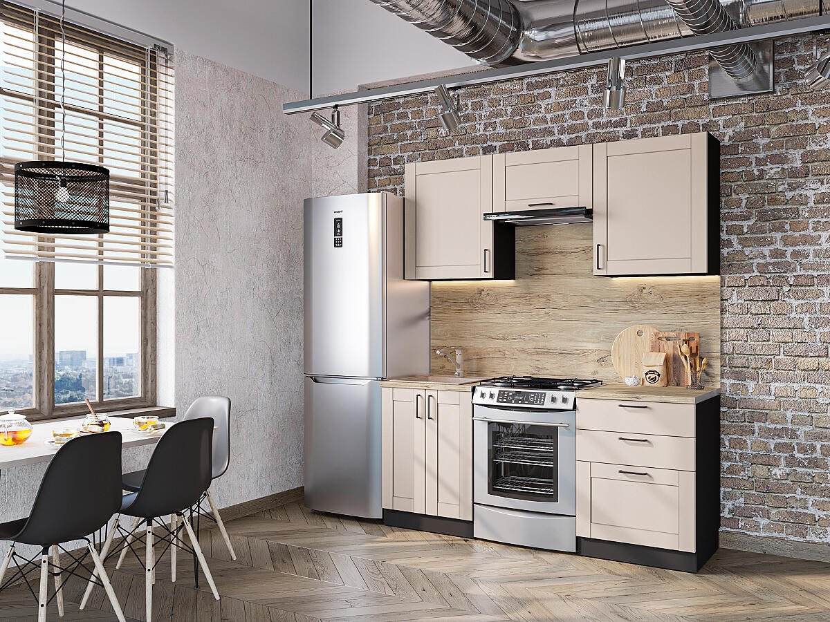 Лофт-05 Cream Silk 72094.Расположение Прямая. Размер (В*Ш*Г) мм 2140*1800*600. Цвет каркасов Graphite. Материал каркасов ЛДСП. Цвет фасадов Cream Silk. Материал фасадов МДФ. Отделка фасадов ПЭТ. Толщина кромки мм .. Стекло . Столешница Редондо. Толщина столешницы мм 38