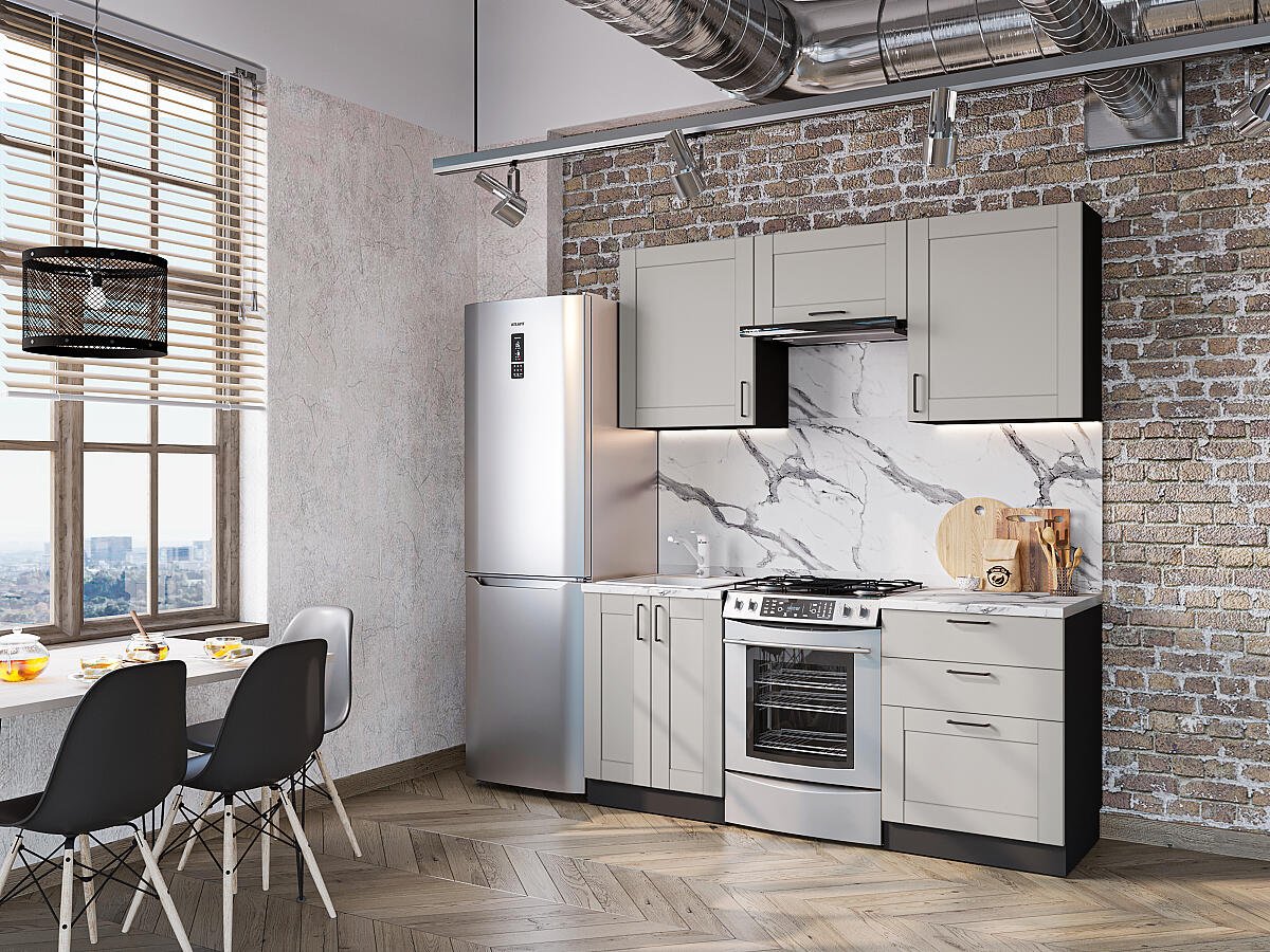 Лофт-05 Grey Silk 71793.Расположение Прямая. Размер (В*Ш*Г) мм 2140*1800*600. Цвет каркасов Graphite. Материал каркасов ЛДСП. Цвет фасадов Grey Silk. Материал фасадов МДФ. Отделка фасадов ПЭТ. Толщина кромки мм .. Стекло . Столешница Гранит белый. Толщина столешницы мм 38