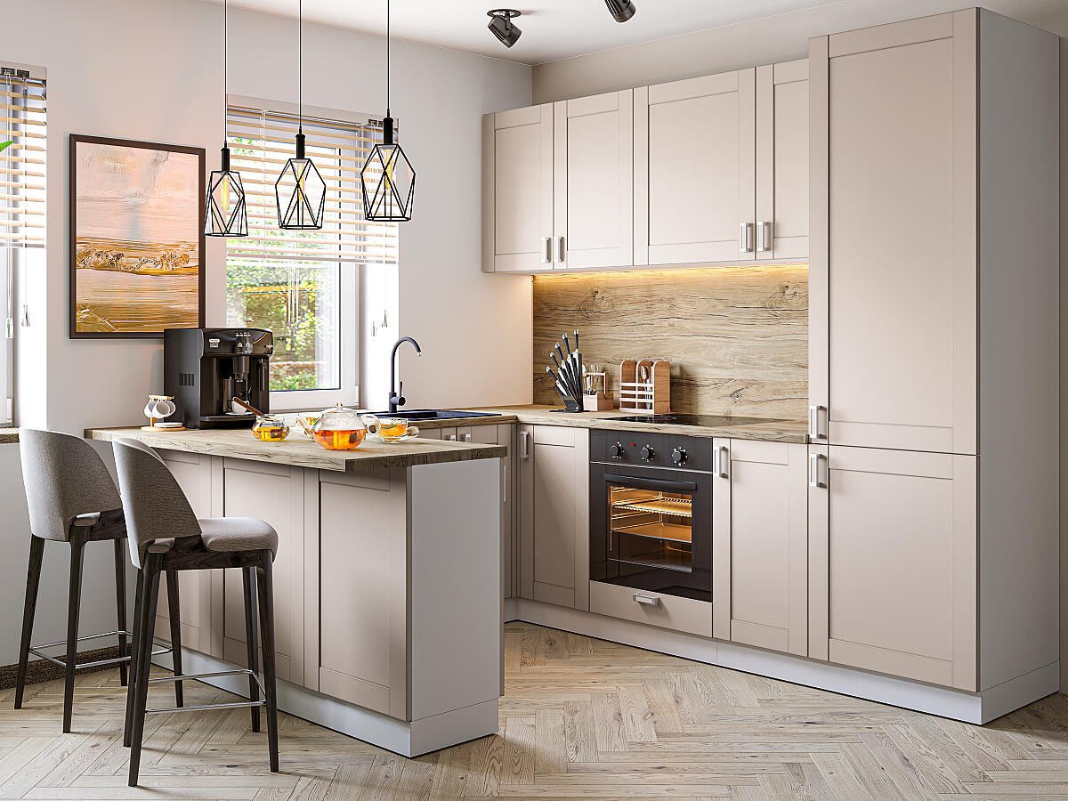 Лофт-06 Cream Silk 72095.Расположение Угловая. Размер (В*Ш*Г) мм 2140*1500/2300/2600*600. Цвет каркасов Белый. Материал каркасов ЛДСП. Цвет фасадов Cream Silk. Материал фасадов МДФ. Отделка фасадов ПЭТ. Толщина кромки мм .. Стекло . Столешница Редондо. Толщина столешницы мм 38