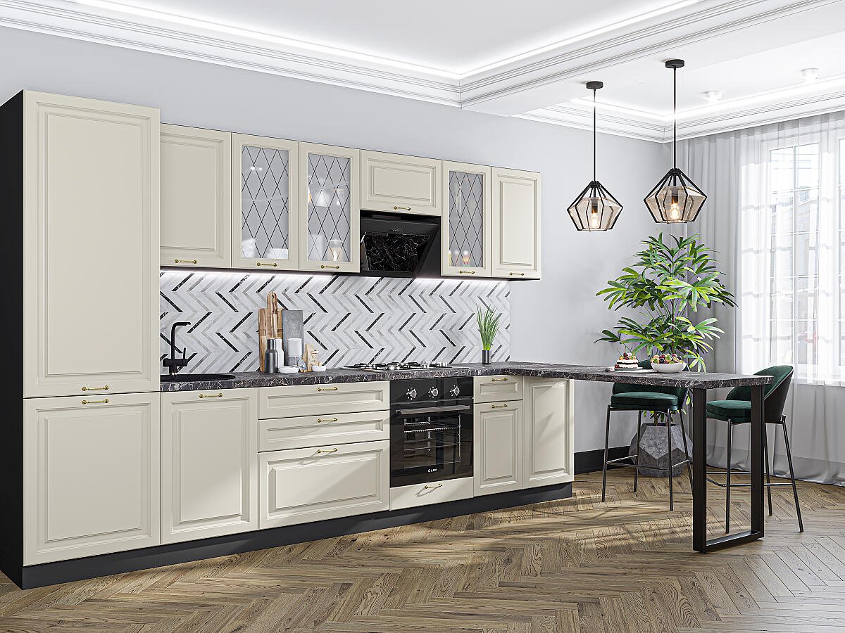 Ницца-02 Агат 77614.Расположение Прямая. Размер (В*Ш*Г) мм 2140*3300*600. Цвет каркасов Graphite. Материал каркасов ЛДСП. Цвет фасадов Агат. Материал фасадов МДФ/Стекло. Отделка фасадов Пленка ПВХ.. Толщина кромки мм .В комплект входит ручка-скоба F351 в цвете Античная бронза с межцентровым расстоянием 96 мм. Стекло White Сrystal — белое художественное сатинато. Рисунок нанесен пескоструем.. Столешница Мрамор черный. Толщина столешницы мм 38