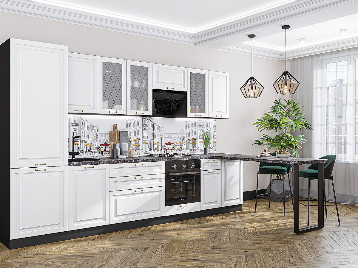 Ницца-02 Белый 77611.Расположение Прямая. Размер (В*Ш*Г) мм 2140*3300*600. Цвет каркасов Graphite. Материал каркасов ЛДСП. Цвет фасадов Белый. Материал фасадов МДФ/Стекло. Отделка фасадов Пленка ПВХ.. Толщина кромки мм .В комплект входит ручка-скоба F351 в цвете Античная бронза с межцентровым расстоянием 96 мм. Стекло White Сrystal — белое художественное сатинато. Рисунок нанесен пескоструем.. Столешница Мрамор черный. Толщина столешницы мм 38
