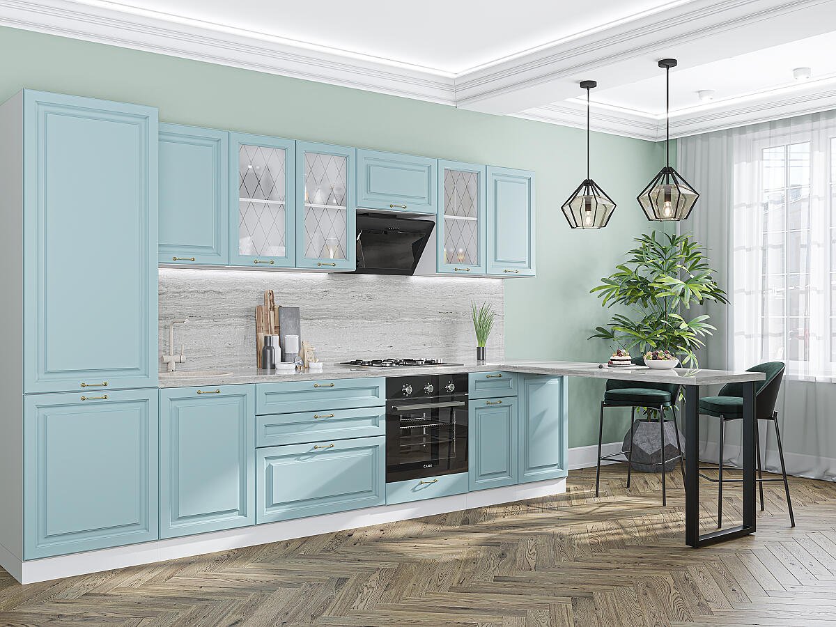 Ницца-02 Голубой 77615.Расположение Прямая. Размер (В*Ш*Г) мм 2140*3300*600. Цвет каркасов Белый. Материал каркасов ЛДСП. Цвет фасадов Голубой. Материал фасадов МДФ/Стекло. Отделка фасадов Пленка ПВХ.. Толщина кромки мм .В комплект входит ручка-скоба F351 в цвете Античная бронза с межцентровым расстоянием 96 мм. Стекло White Сrystal — белое художественное сатинато. Рисунок нанесен пескоструем.. Столешница Песчаный камень глянец. Толщина столешницы мм 38
