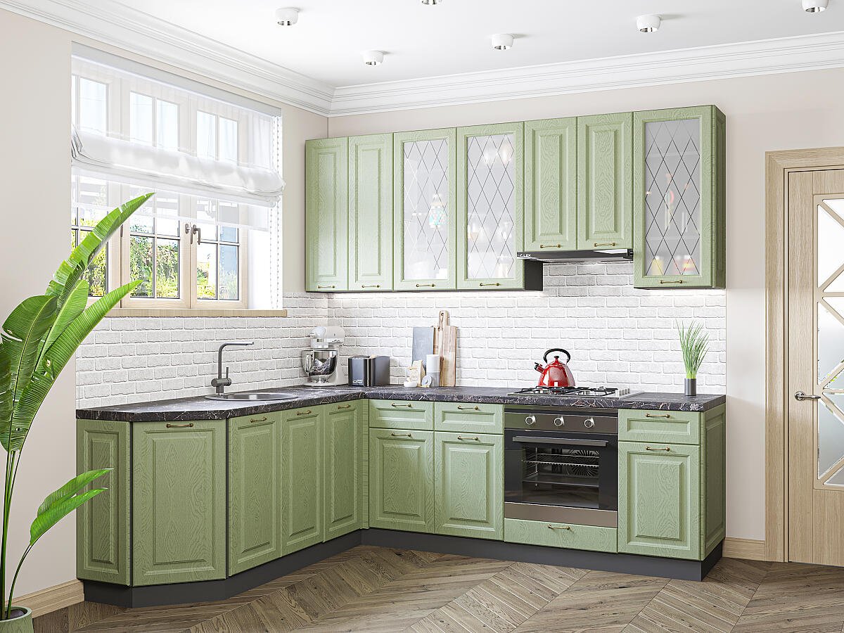 Ницца-03 Дуб оливковый 77622.Расположение Угловая. Размер (В*Ш*Г) мм 2340*1890/2400*600. Цвет каркасов Graphite. Материал каркасов ЛДСП. Цвет фасадов Дуб оливковый. Материал фасадов МДФ/Стекло. Отделка фасадов Пленка ПВХ.. Толщина кромки мм .В комплект входит ручка-скоба F351 в цвете Античная бронза с межцентровым расстоянием 96 мм. Стекло White Сrystal — белое художественное сатинато. Рисунок нанесен пескоструем.. Столешница Мрамор черный. Толщина столешницы мм 38