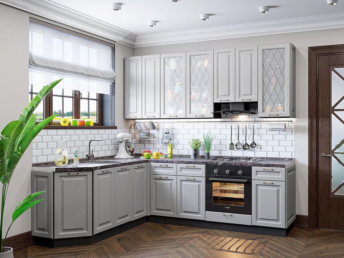 Ницца-03 Графит 77623.Расположение Угловая. Размер (В*Ш*Г) мм 2340*1890/2400*600. Цвет каркасов Graphite. Материал каркасов ЛДСП. Цвет фасадов Графит. Материал фасадов МДФ/Стекло. Отделка фасадов Пленка ПВХ.. Толщина кромки мм .В комплект входит ручка-скоба F351 в цвете Античная бронза с межцентровым расстоянием 96 мм. Стекло White Сrystal — белое художественное сатинато. Рисунок нанесен пескоструем.. Столешница Мрамор черный. Толщина столешницы мм 38