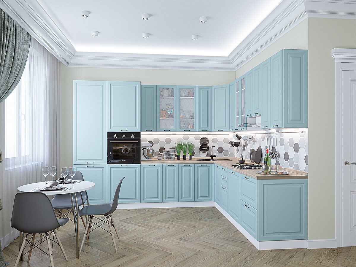 Ницца-04 Голубой 77627.Расположение Угловая. Размер (В*Ш*Г) мм 2340*3200/2700*600. Цвет каркасов Белый. Материал каркасов ЛДСП. Цвет фасадов Голубой. Материал фасадов МДФ/Стекло. Отделка фасадов Пленка ПВХ.. Толщина кромки мм .В комплект входит ручка-скоба F351 в цвете Античная бронза с межцентровым расстоянием 96 мм. Стекло White Сrystal — белое художественное сатинато. Рисунок нанесен пескоструем.. Столешница Редондо. Толщина столешницы мм 38