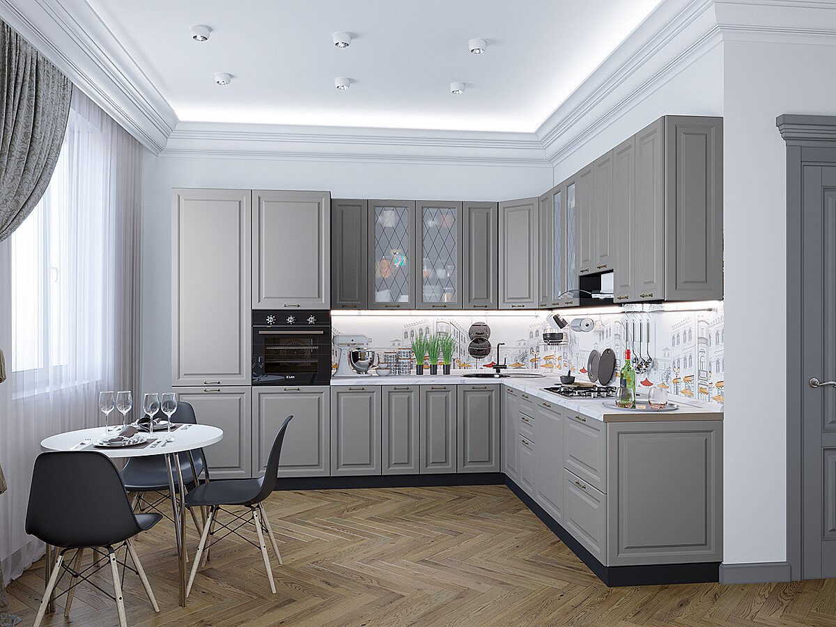 Ницца-04 Графит 77629.Расположение Угловая. Размер (В*Ш*Г) мм 2340*3200/2700*600. Цвет каркасов Graphite. Материал каркасов ЛДСП. Цвет фасадов Графит. Материал фасадов МДФ/Стекло. Отделка фасадов Пленка ПВХ.. Толщина кромки мм .В комплект входит ручка-скоба F351 в цвете Античная бронза с межцентровым расстоянием 96 мм. Стекло White Сrystal — белое художественное сатинато. Рисунок нанесен пескоструем.. Столешница Гранит белый. Толщина столешницы мм 38
