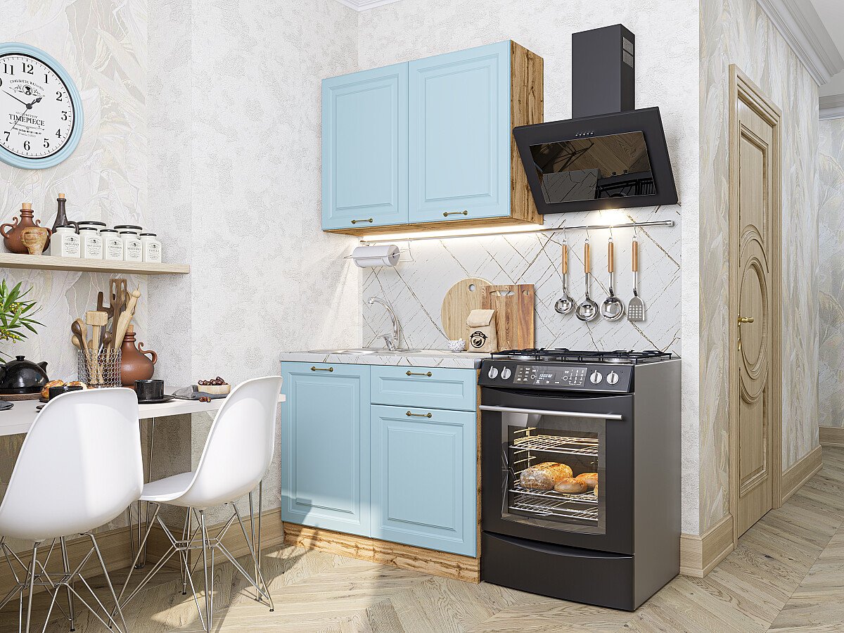 Ницца-05 Голубой 66758.Расположение Прямая. Размер (В*Ш*Г) мм 2140*1000*600. Цвет каркасов Дуб Вотан. Материал каркасов ЛДСП. Цвет фасадов Голубой. Материал фасадов МДФ. Отделка фасадов Пленка ПВХ.. Толщина кромки мм .В комплект входит ручка-скоба F351 в цвете Античная бронза с межцентровым расстоянием 96 мм. Стекло . Столешница Пирит светлый. Толщина столешницы мм 38