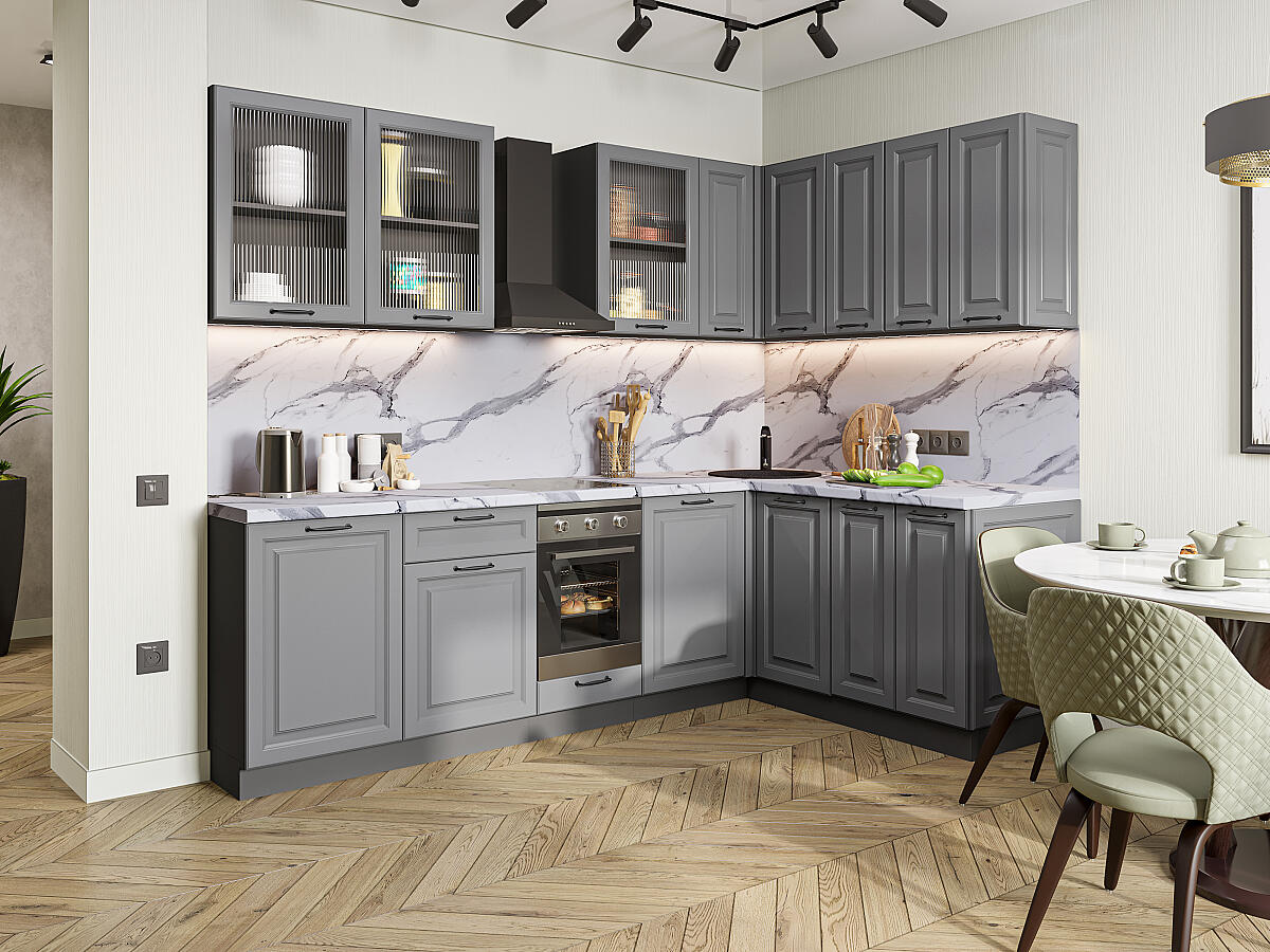 Ницца Royal-02 Magnum 77637.Расположение Угловая. Размер (В*Ш*Г) мм 2140*2550/1600*600. Цвет каркасов Graphite. Материал каркасов ЛДСП. Цвет фасадов Magnum. Материал фасадов МДФ/Стекло. Отделка фасадов Эмаль высокой прочности Renner (Италия).. Толщина кромки мм .Внимание Ручка в комплект не входит.. Стекло Рифлёное стекло MORU.. Столешница Гранит белый. Толщина столешницы мм 38