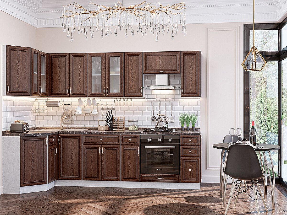 Шале-03 Brown Dreamline 54048.Расположение Угловая. Размер (В*Ш*Г) мм 2140*1300/2800*600. Цвет каркасов Белый. Материал каркасов ЛДСП. Цвет фасадов Brown Dreamline. Материал фасадов МДФ/Стекло. Отделка фасадов Эко Шпон. Толщина кромки мм .Внимание Ручка в комплект не входит.. Стекло Сатинато белое Magic Fog.. Столешница Мрамор черный. Толщина столешницы мм 38
