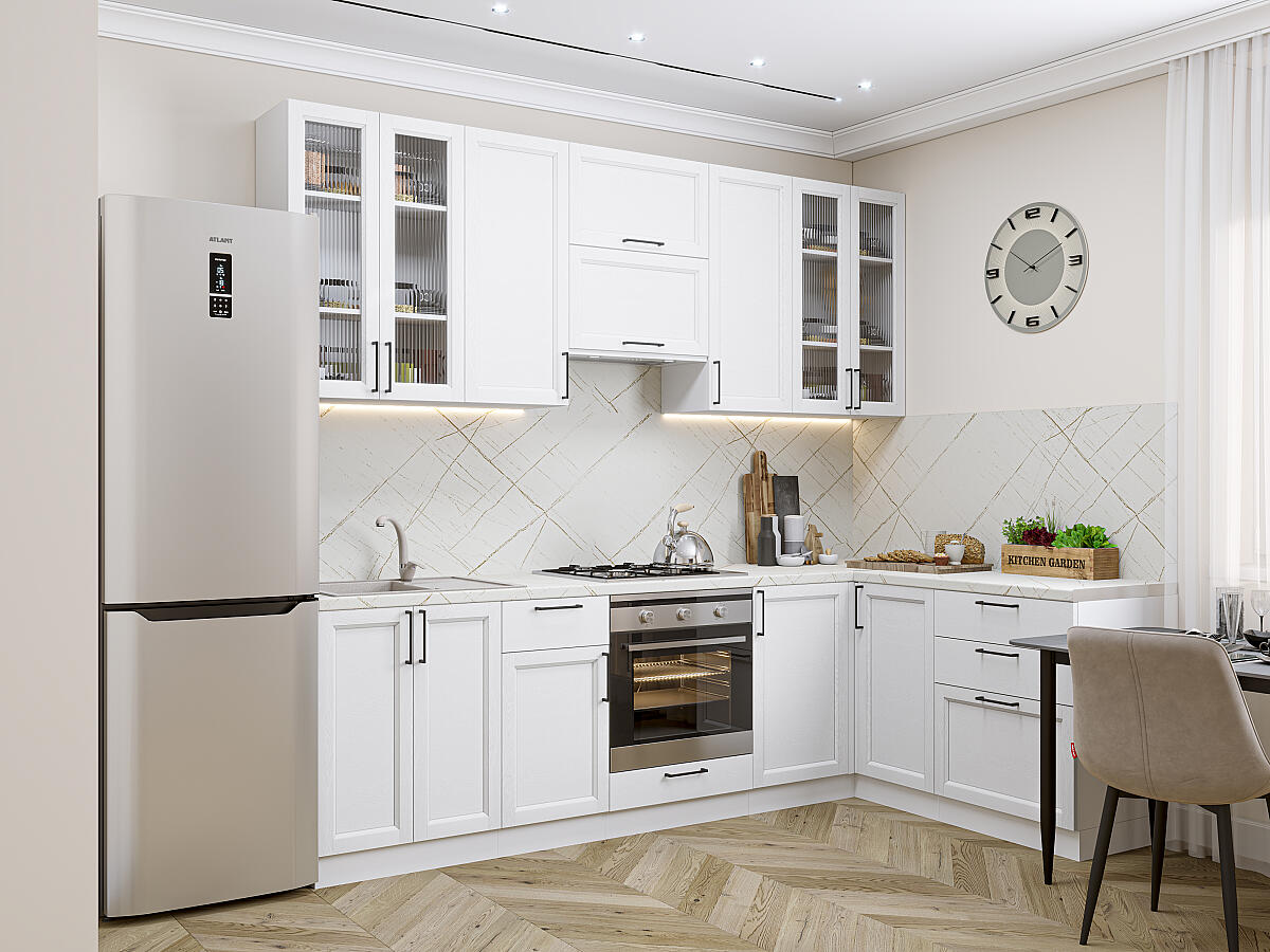 Сканди-04 White Silkwood 71778.Расположение Угловая. Размер (В*Ш*Г) мм 2340*2650/1590*600. Цвет каркасов Белый. Материал каркасов ЛДСП. Цвет фасадов White Silkwood. Материал фасадов МДФ/Стекло. Отделка фасадов ПЭТ. Толщина кромки мм .Внимание Ручка в комплект не входит.. Стекло Рифлёное Magic Moru V.. Столешница Пирит светлый. Толщина столешницы мм 38