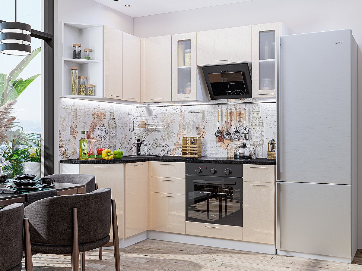 Валерия-М-04 Бежевый металлик 51462.Расположение Угловая. Размер (В*Ш*Г) мм 2140*1300/1900*600. Цвет каркасов Белый. Материал каркасов ЛДСП. Цвет фасадов Бежевый металлик. Материал фасадов МДФ/Стекло. Отделка фасадов Пленка ПВХ.. Толщина кромки мм .В комплект входит ручка рейлинг в цвете Хром/Глянец с межцентровым расстоянием 96 мм. Стекло Сатинато белое.. Столешница Гэлакси. Толщина столешницы мм 38