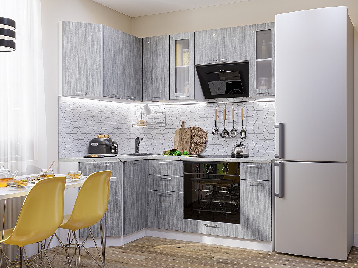 Валерия-М-04 Серый металлик дождь светлый 24212.Расположение Угловая. Размер (В*Ш*Г) мм 2140*1300/2000*600. Цвет каркасов Белый. Материал каркасов ЛДСП. Цвет фасадов Серый металлик дождь светлый. Материал фасадов МДФ/Стекло. Отделка фасадов Пленка ПВХ.. Толщина кромки мм .В комплект входит ручка рейлинг в цвете Хром/Глянец с межцентровым расстоянием 96 мм. Стекло Сатинато белое.. Столешница Пирит светлый. Толщина столешницы мм 38