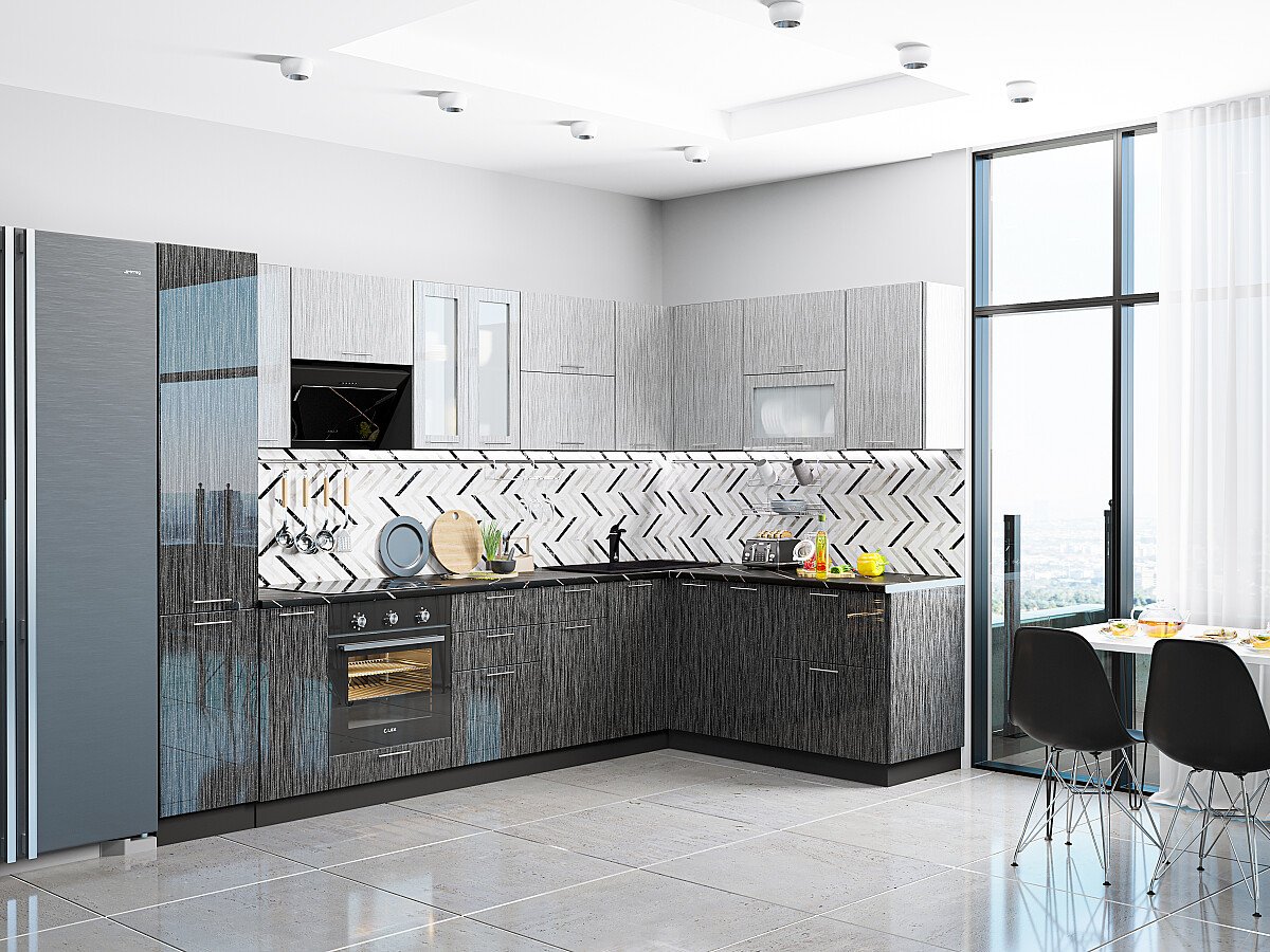 Валерия-М-05 Серый металлик дождь светлый/Черный металлик дождь 24214.Расположение Угловая. Размер (В*Ш*Г) мм 2140*3200/1800*600. Цвет каркасов Белый/Graphite. Материал каркасов ЛДСП. Цвет фасадов Серый металлик дождь светлый/Черный металлик дождь. Материал фасадов МДФ/Стекло. Отделка фасадов Пленка ПВХ.. Толщина кромки мм .В комплект входит ручка рейлинг в цвете Хром/Глянец с межцентровым расстоянием 96 мм. Стекло Сатинато белое.. Столешница Пирит темный. Толщина столешницы мм 38